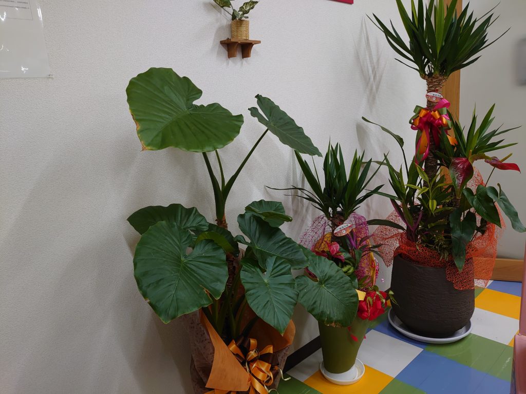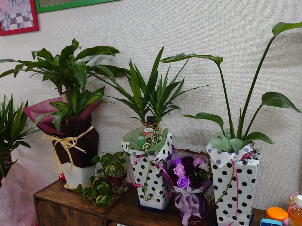 かぎしっぽのオープンの時にお祝いとして頂いた観葉植物が主で、手入れと言っても水やりと時々液体肥料をあげるくらいですが、朝来た時からみどりいっぱいでいつも癒されます。