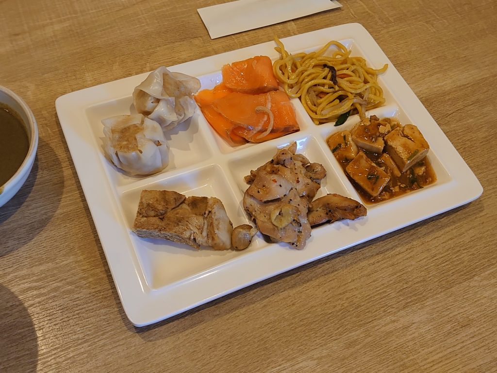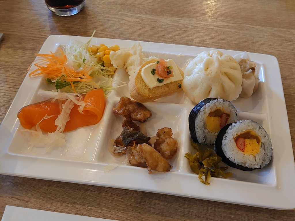 色んなお料理が並んでいて、目移りしてテーマも何もなく取ってきてしまった自分のプレートがこちらです(^^;