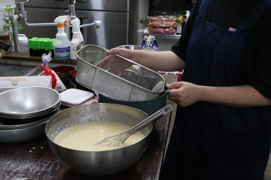 色々と同時進行で進みますが、クレープ生地を作ったり生クリームを泡立てたりもします。