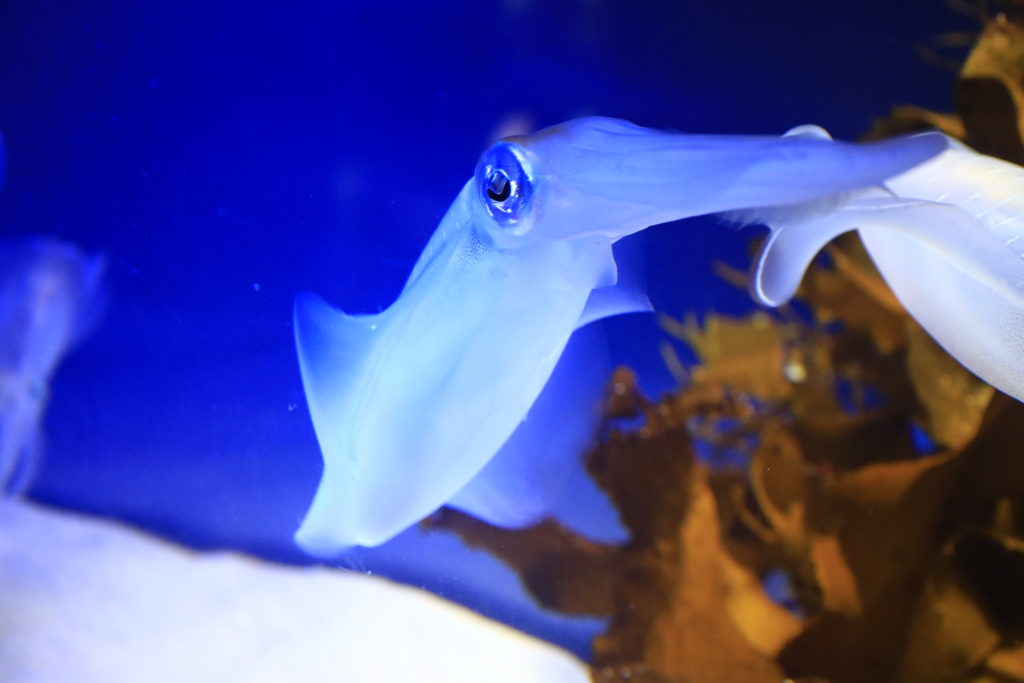 イワシやイカなどの展示を見ながら「食べられるかな?美味しいかな?」といったすぐに何でもすぐに食べようとする人と話をしながら屋内の展示を見て回り。